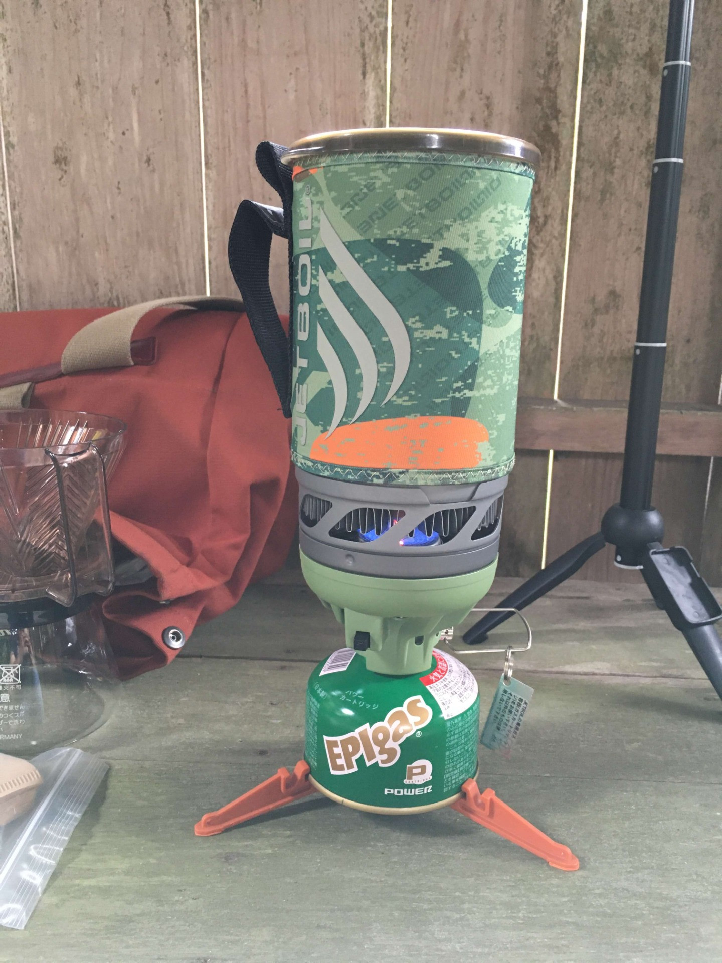 流行りのジェットボイルだぜ!この商品はアマゾンで買いました!使い勝手のいい点火装置付き!なのですが、点火装置が壊れていました(笑)。店で不良を確認済みだったので、チャッカマンを持ってきてました。ガスを出し、チャッカマンにて点火!